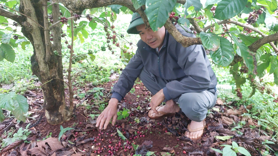 Tương tự, vườn cà phê của gia đình ông Phạm Văn Thịnh (thôn 2, xã Ia Hrung) đã chín nhưng mưa kèm gió mạnh gây rụng trái, ảnh hưởng đến việc thu hoạch.